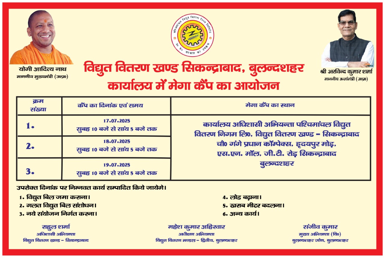 सिकंदराबाद: विद्युत उपभोक्ताओं की समस्याओं के त्वरित समाधान हेतु पश्चिमांचल विद्युत वितरण निगम लिमिटेड की ओर से तीन दिवसीय मेगा कैम्प का आयोजन किया जा रहा है। यह कैम्प 17, 18 एवं 19 जुलाई 2025 को सुबह 10:00 बजे से शाम 5:00 बजे तक आयोजित किया जाएगा।