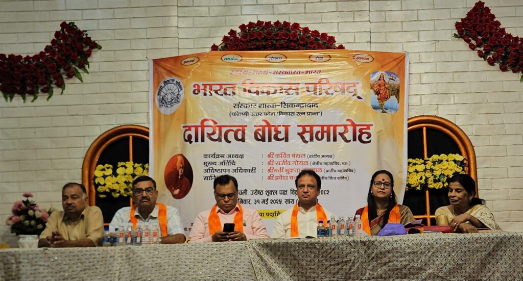 सिकंदराबाद: भारत विकास परिषद् सिकंदराबाद संस्कार शाखा द्वारा पंचवटी मैरिज होम में शनिवार को दायित्व बोध समारोह का आयोजन किया गया। कार्यक्रम की शुरुआत प्रान्तीय व जिला पदाधिकारियों द्वारा भारत माता, स्वामी विवेकानंद एवं रानी अहिल्या बाई होल्कर के चित्रों पर माल्यार्पण व दीप प्रज्वलन के साथ विधिवत रूप से की गई।