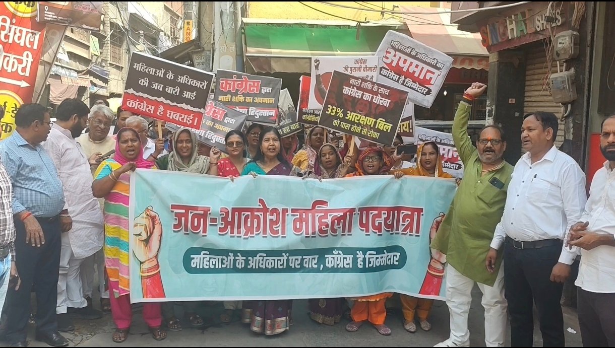 सिकंदराबाद: भारतीय जनता पार्टी ने नगर में महिला आरक्षण से जुड़े नारी शक्ति वंदन अधिनियम-2026 को लेकर जन आक्रोश महिला पदयात्रा निकाली। नगर अध्यक्ष त्रिवेश गुप्ता के नेतृत्व में निकली यह पदयात्रा जैन मंदिर से शुरू होकर मुख्य बाजारों से होते हुए दनकौर तिराहे पर समाप्त हुई, जहां विपक्ष का पुतला दहन कर विरोध दर्ज कराया गया।