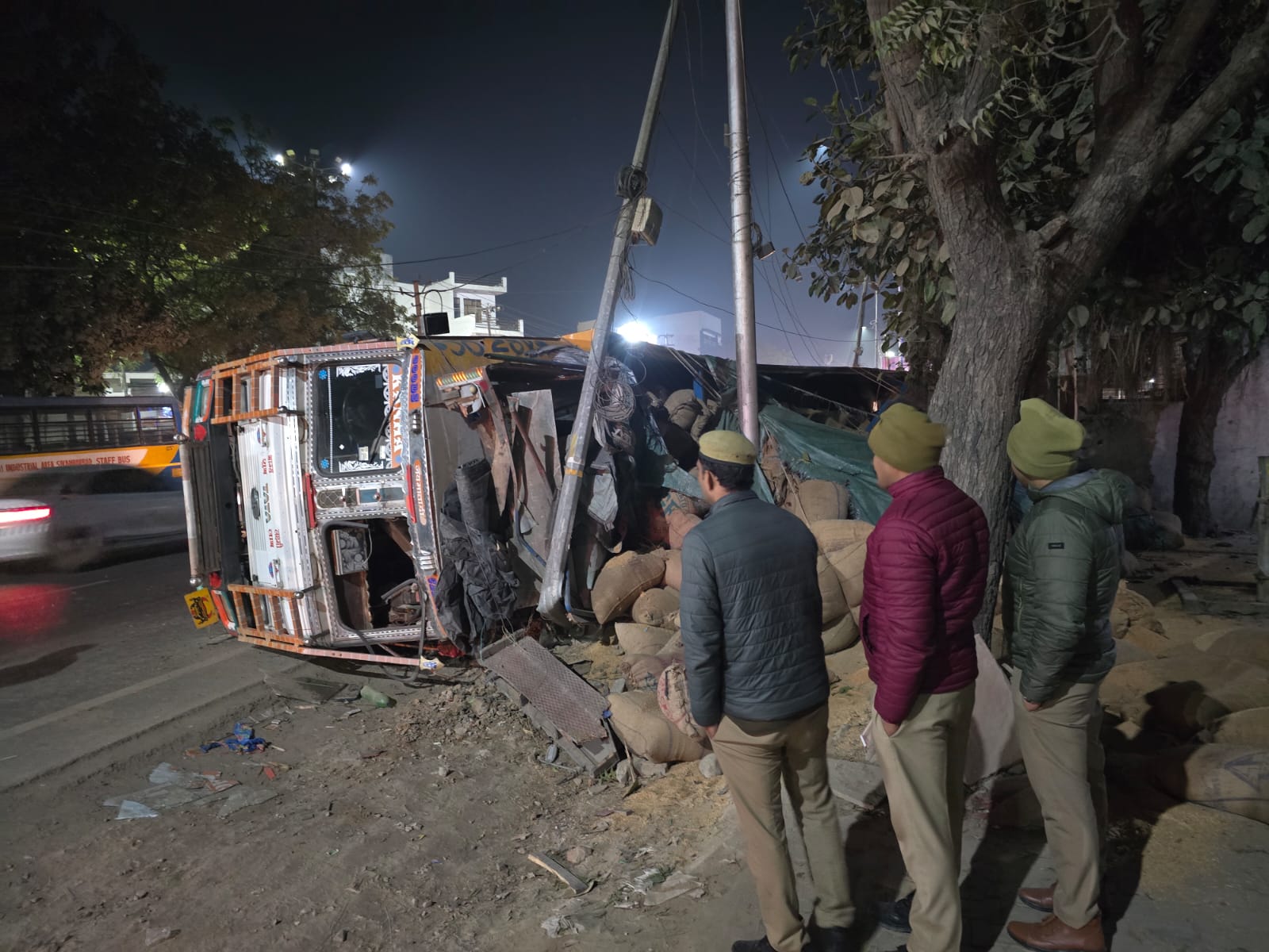 सिकंदराबाद: बैरिकेडिंग के बीच गाय आने से पलटा अनाज ट्रक,दो घायल
