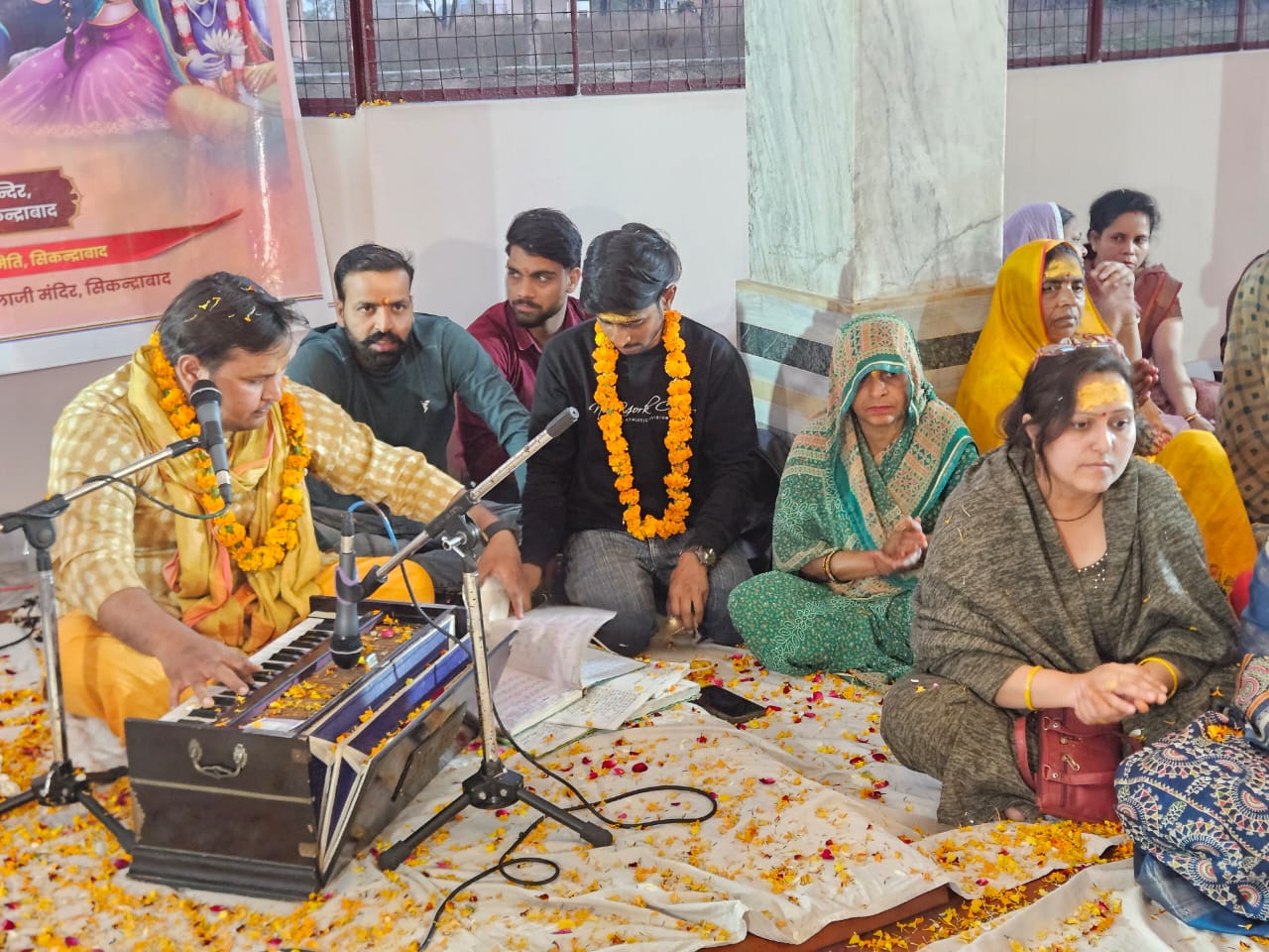 भजन संध्या में हरि गुणगान गिरधर बृजवासी टीम, सिकन्द्राबाद ने होली एवं राधा-कृष्ण से जुड़े सुमधुर भजनों की प्रस्तुति दी। “रंग बरसे श्याम के” और “होली खेले रघुवीरा” जैसे भजनों पर श्रद्धालु भावविभोर होकर झूम उठे। पूरे मंदिर परिसर को फूलों व रंग-बिरंगी रोशनी से आकर्षक ढंग से सजाया गया था, जिससे माहौल भक्तिमय हो गया।