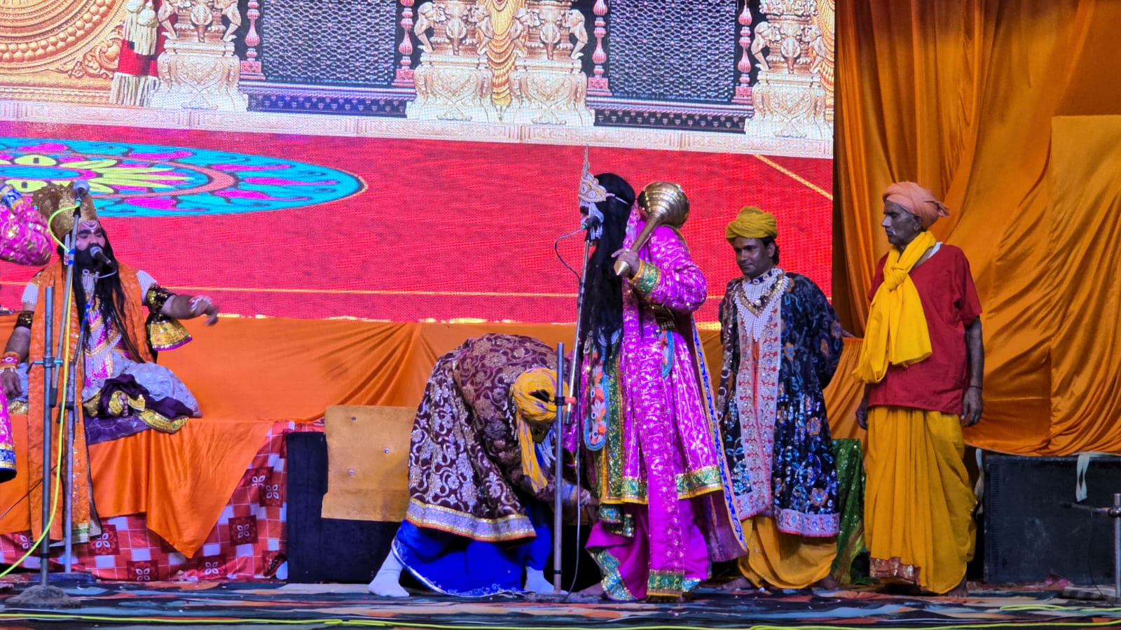 लीला के अगले प्रसंग में अंगद को रावण के दरबार में दूत बनाकर भेजा गया। अंगद ने रावण को समझाने का प्रयास किया, लेकिन रावण नहीं माना। तब अंगद ने अपना पैर दरबार में जमा दिया और कहा कि यदि कोई इसे उठा देगा तो मैं वापस चला जाऊंगा। रावण के हजारों योद्धा अंगद का पैर नहीं हिला सके। अंततः रावण स्वयं आया, तभी अंगद ने पैर स्वयं हटा लिया और कहा—“तुम मेरे चरणों में नहीं, भगवान श्रीराम के चरणों में जाओ, वही तुम्हारा कल्याण करेंगे।” इसके बाद अंगद रामा दल में लौट गए।