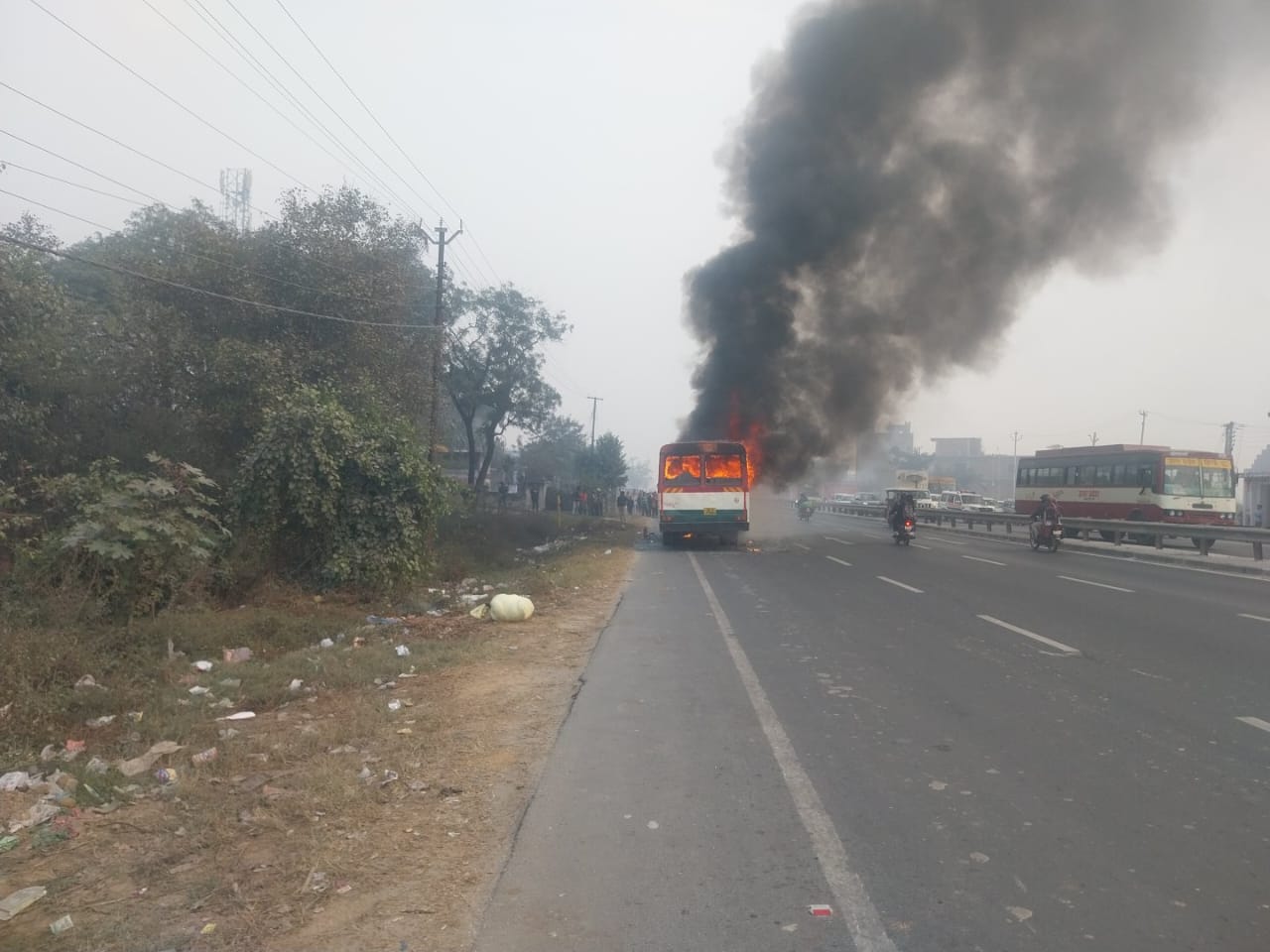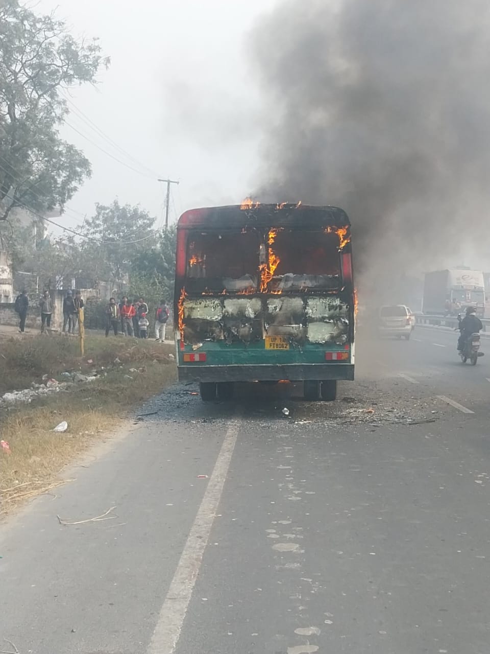 सिकंदराबाद के NH-34 पर कौशांबी से अलीगढ़ जा रही रोडवेज बस में अचानक भीषण आग लग गई। 35 यात्रियों को सुरक्षित बाहर निकाला गया।